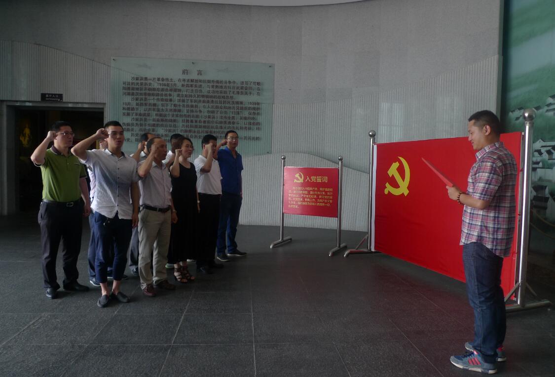 在沙家浜抗日紀念館,新入黨的張仕恩同志面對黨旗莊嚴宣誓,全體黨員也面對著黨旗重溫入黨誓詞,莊嚴向黨宣誓,表達了對黨的忠誠和信仰。短短一天的行程,東進橋、抗日司令部、民俗街、葉飛委員長題詞的照壁、軍民魚水情主題雕塑等等都給我們留下了深刻的印象。